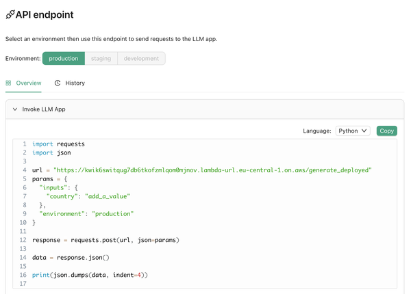 We've introduced a feature that allows you to use Agenta as a prompt registry or management system. In the deployment view, we now provide an endpoint to directly fetch the latest version of your prompt. Here is how it looks like: