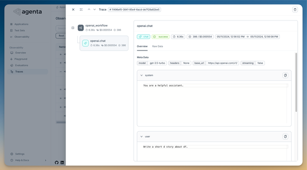 • The SDK is Otel-compatible, and we’ve already tested integrations for OpenAI, LangChain, LiteLLM, and Instructor, with guides available for each. In most cases, adding a few lines of code will have you seeing traces directly in Agenta.