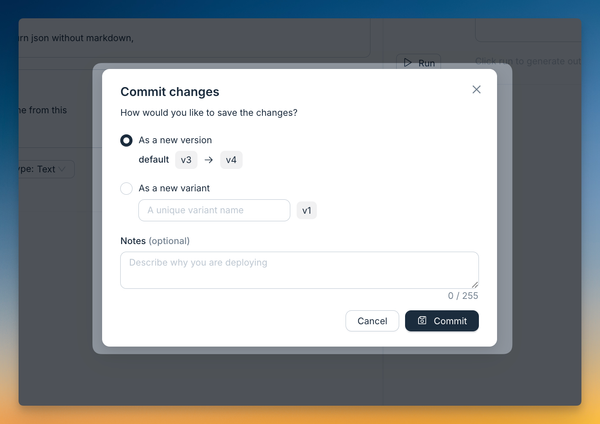 Most changes made while iterating on a variant are experimental and not immediately deployed to production. This separation allows you to experiment freely before pushing changes to live environments. Environments are versioned separately from variants, enabling rollbacks if needed.